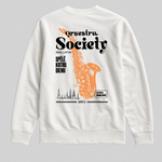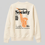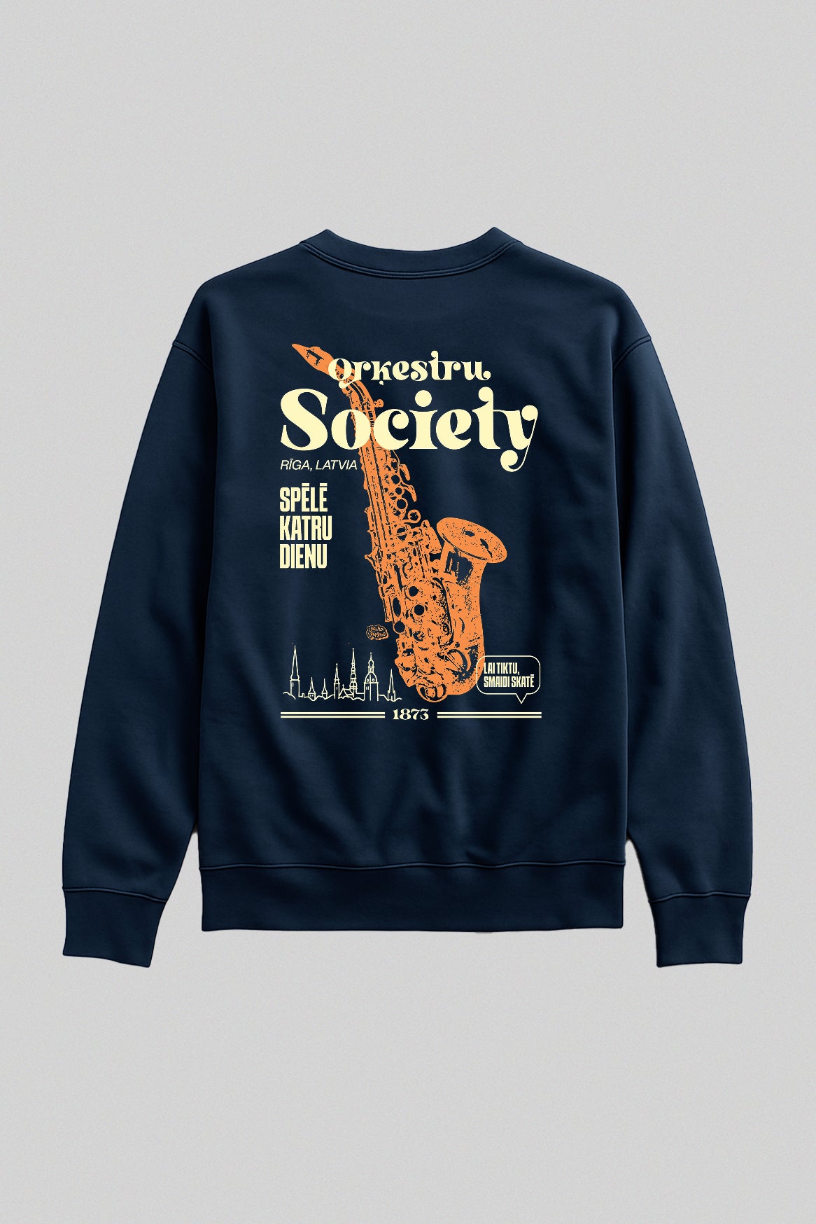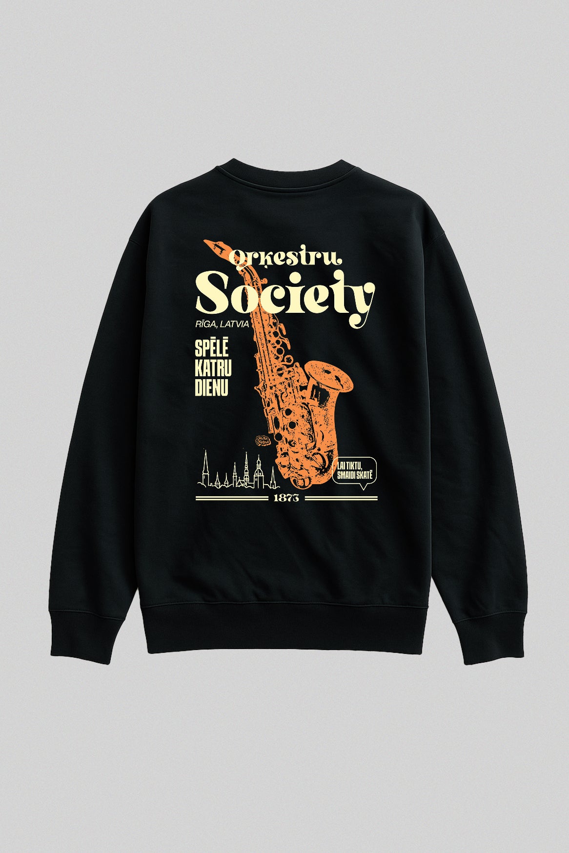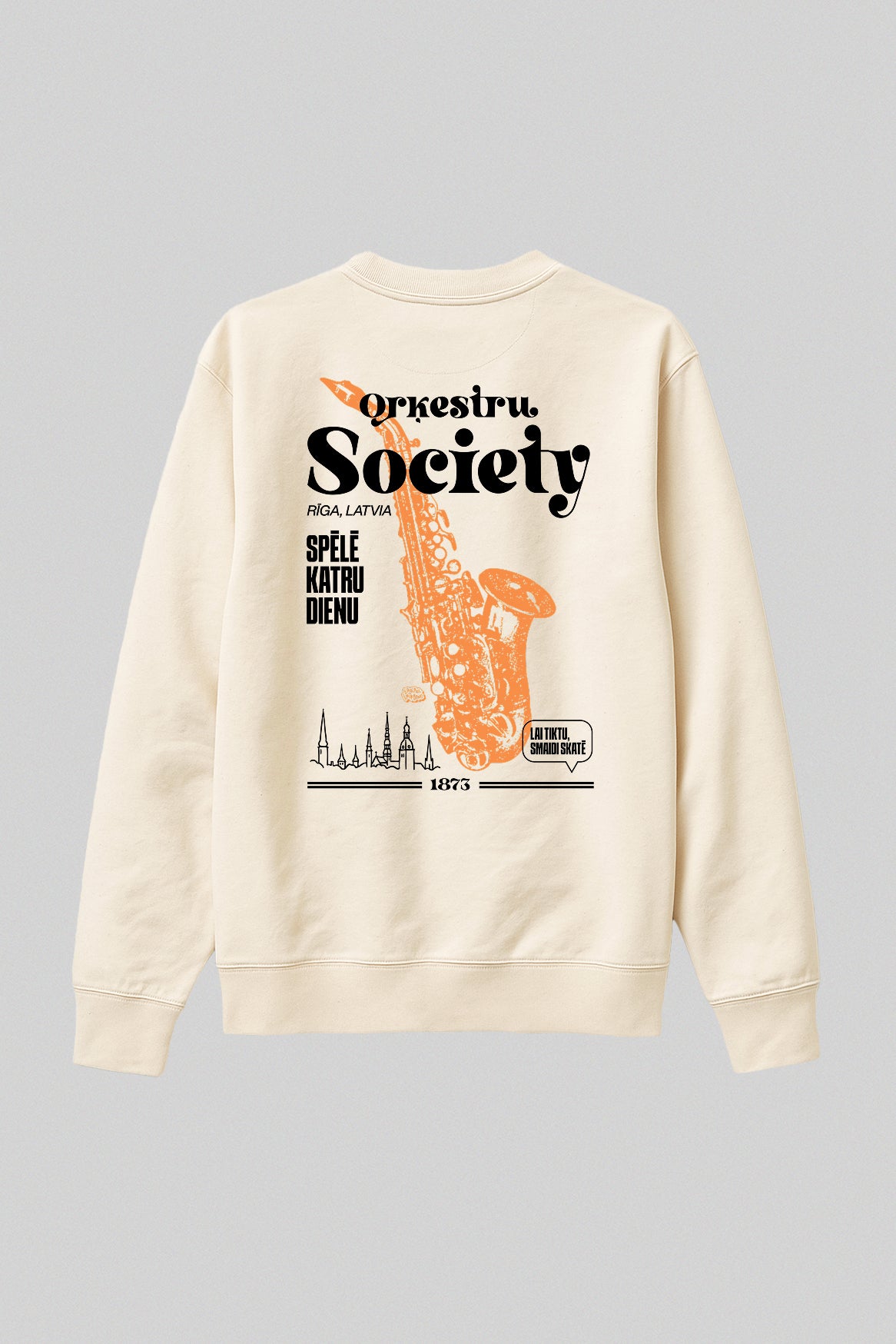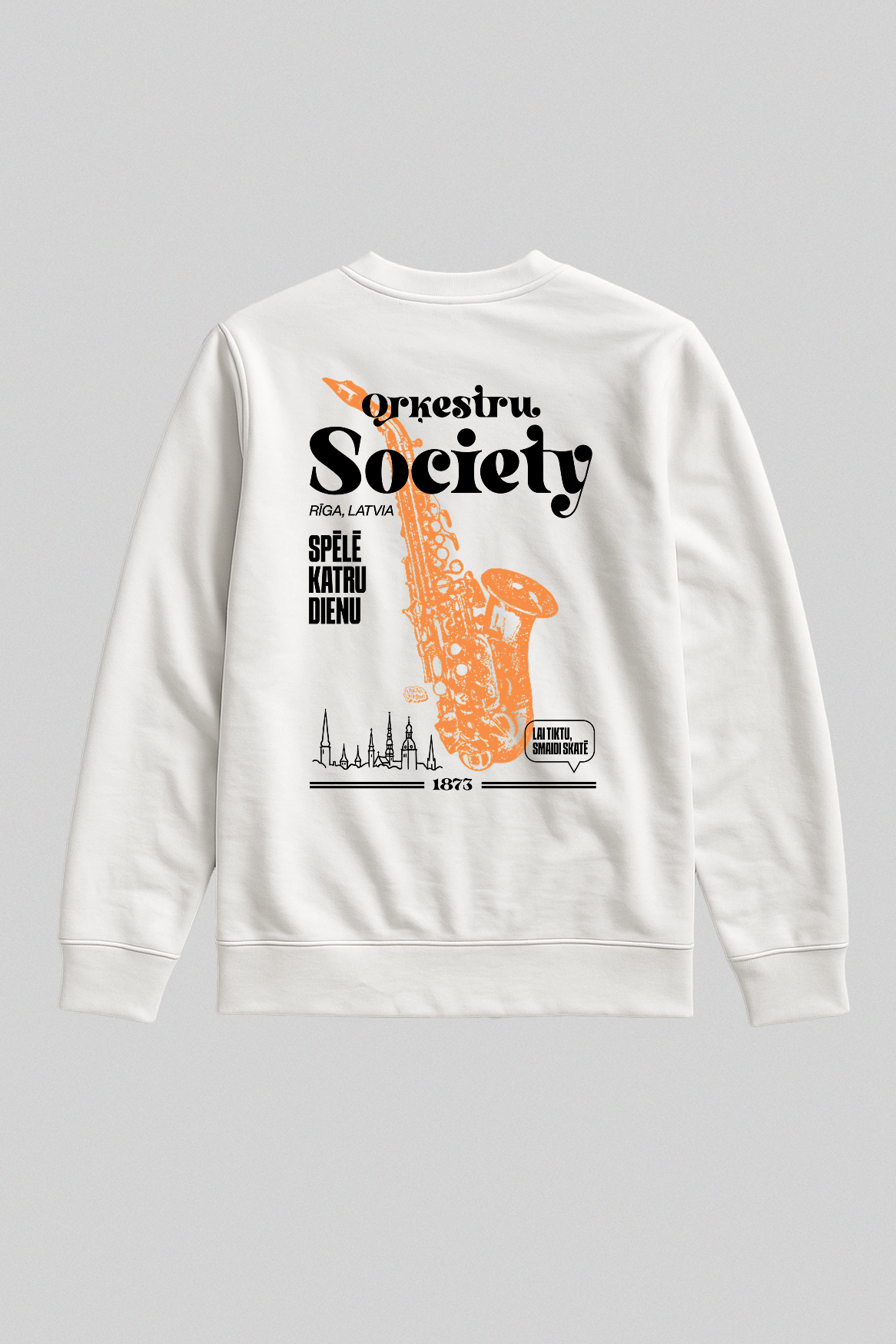 No Mežaparka estrādes līdz mazpilsētas skolas gaitenim Latvijā vienmēr atrodas kāds, kurš sasparojas “iedvest dzīvi misiņā”. Šis džemperis ir aplausi visiem pūtējiem, sitējiem un diriģentiem: uz muguras deg retro-oranžs saksofons, pāri tam lepni slīd uzraksts Orķestru Society, bet sānos atskan devīze SPĒLĒ KATRU DIENU. Uzvelc – un lai pilsētas troksnis pārtop mazā džeza improvizācijā.