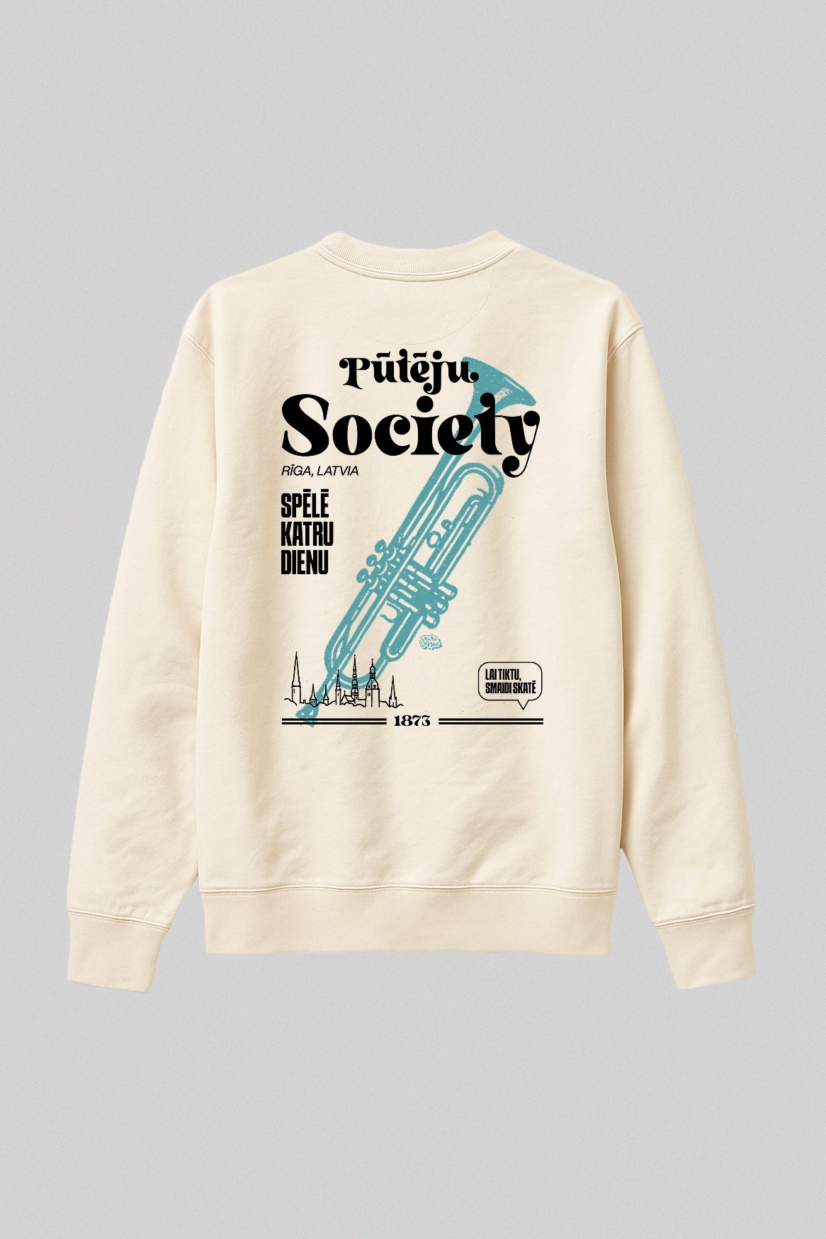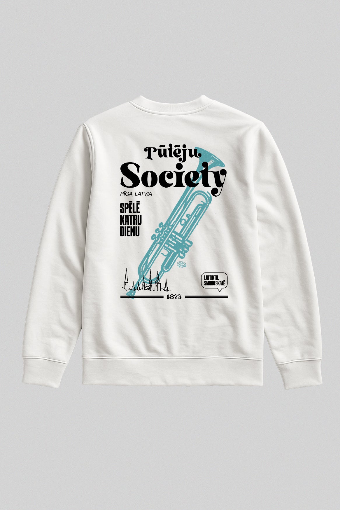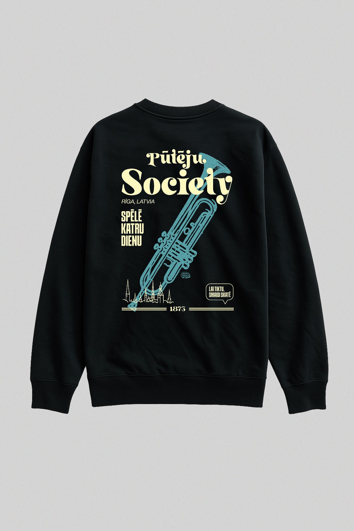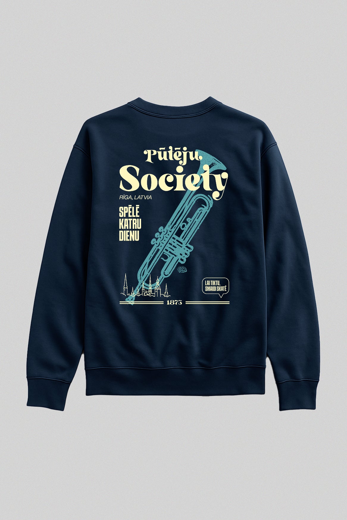 No Jūrmalas prospekta gājiena līdz mazpilsētas zaļumballei: tiklīdz atskan pirmā trompetes nots, Latvija sastingst goda stājā un pēc tam soļo līdzi. Šis džemperis ir izveidots tieši tiem, kas pazīst misiņa elpu — uz muguras iespaidīgs, retro-zilganzaļš trompets siluets, pāri tam lepns uzraksts Pūteju Society un devīze “Spēlē katru dienu”. Uzvelc un pasaki pasaulei, ka tavs pulkstenis sit četrdaļu takti.