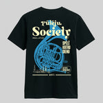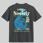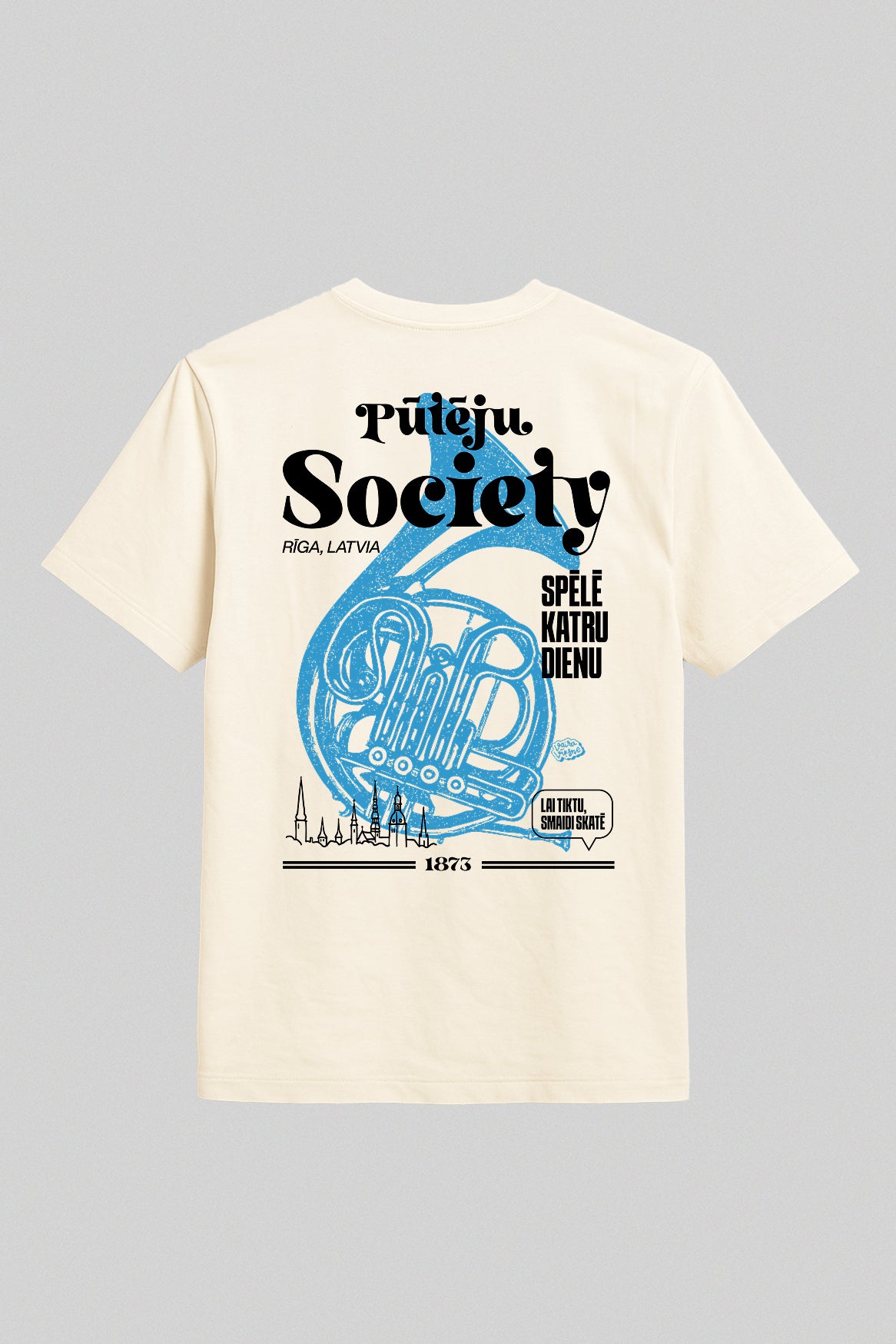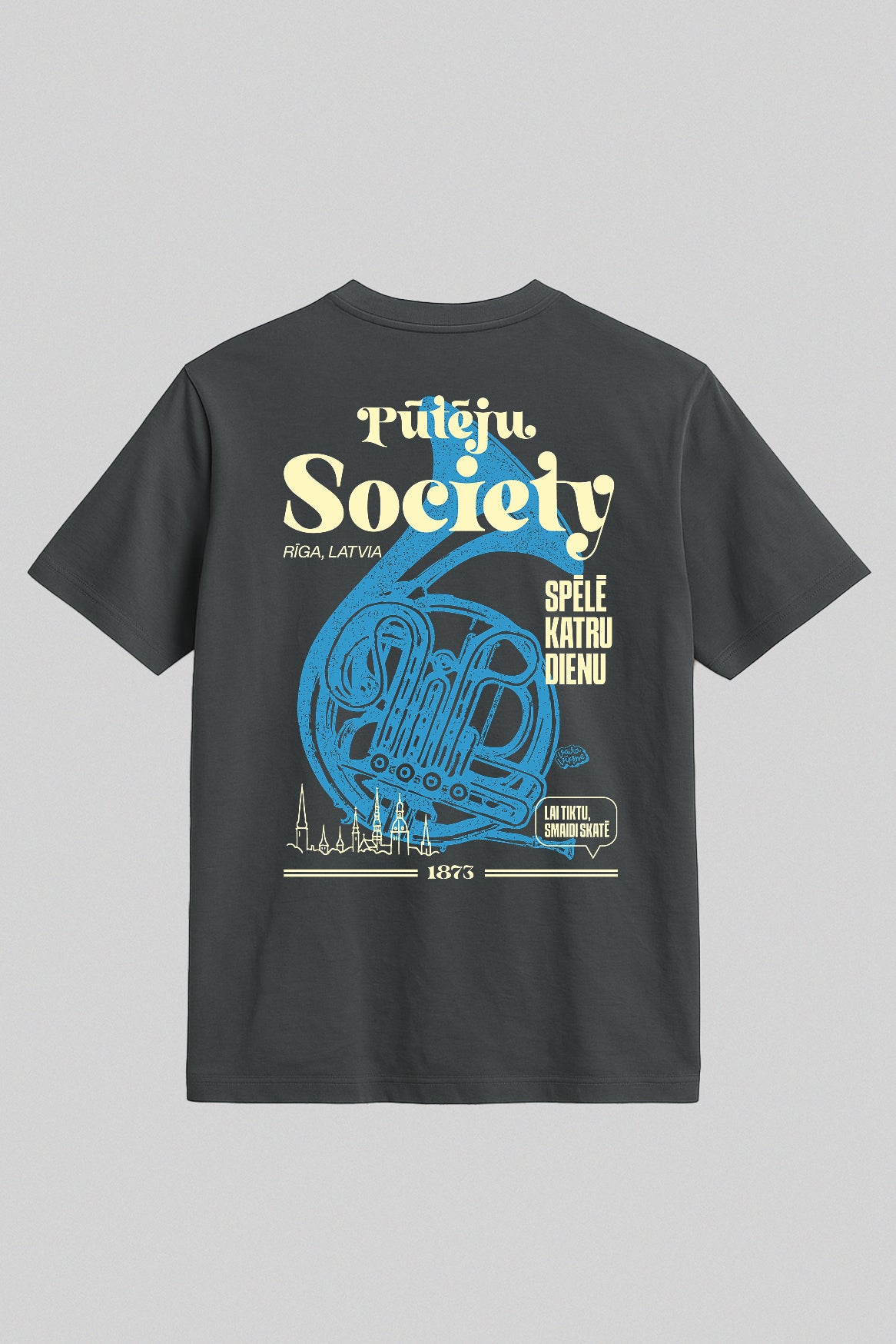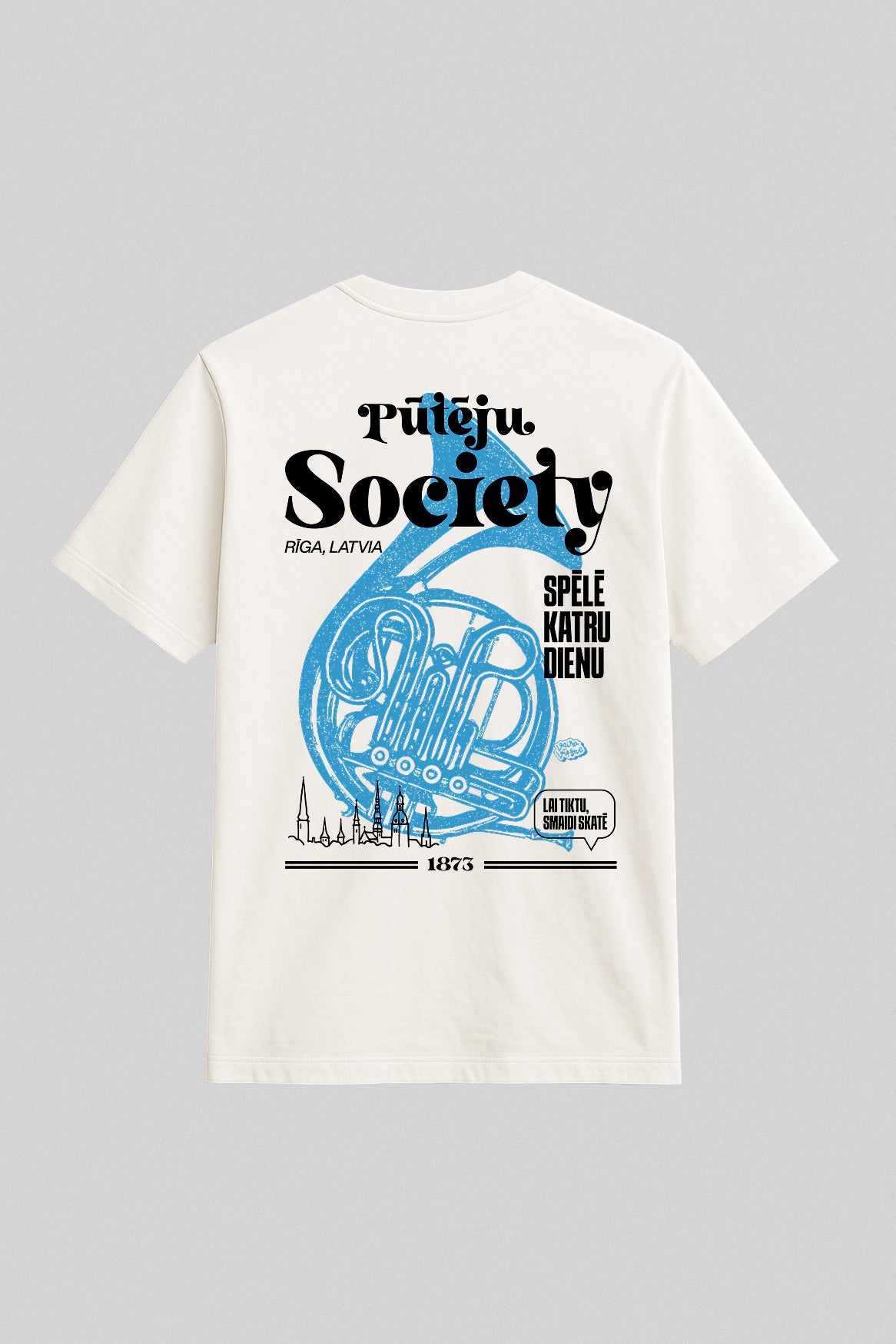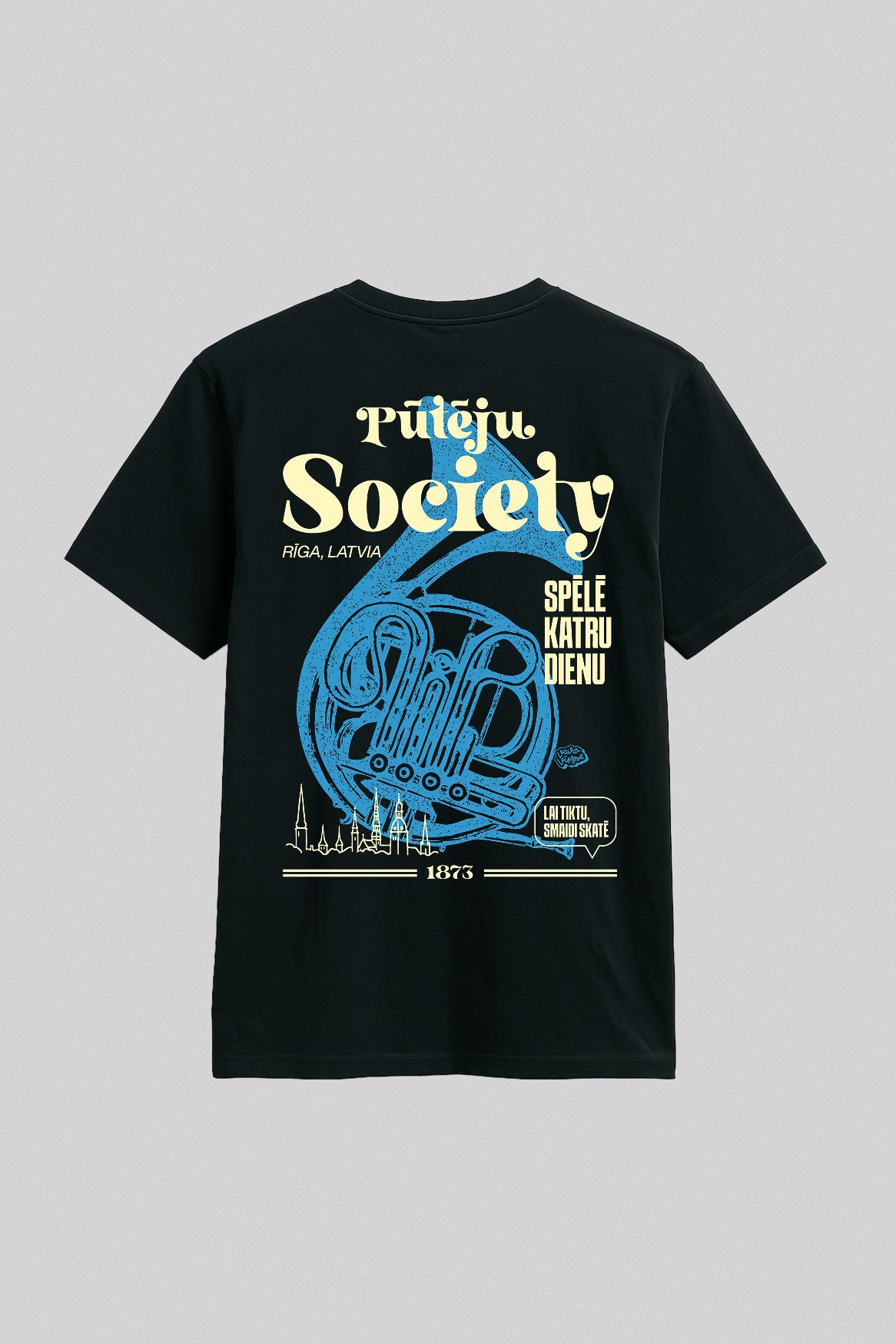 Latvijas vasara bez pūtēju orķestra ir kā estrāde bez ozolu vainaga: neiespējami iedomāties. Kopš 1873. gada tūkstošiem misiņa caurules, spīdīgi taureņu vārsti un rīta rasā atvēsinātas tvertnes saliekas vienā elpā, lai pilsētu torņi atbalstītu “Dzintara dziesmu”. Šis krekls ieliek visu to skaļo lepnumu uz auduma: gigantisks tubas siluets, sauklis “Spēlē katru dienu” un drosmīgais uzraksts Pūteju Society — paraksts visiem, kas zina, kā skan īsta kordziesma ar trompetes piedevu.