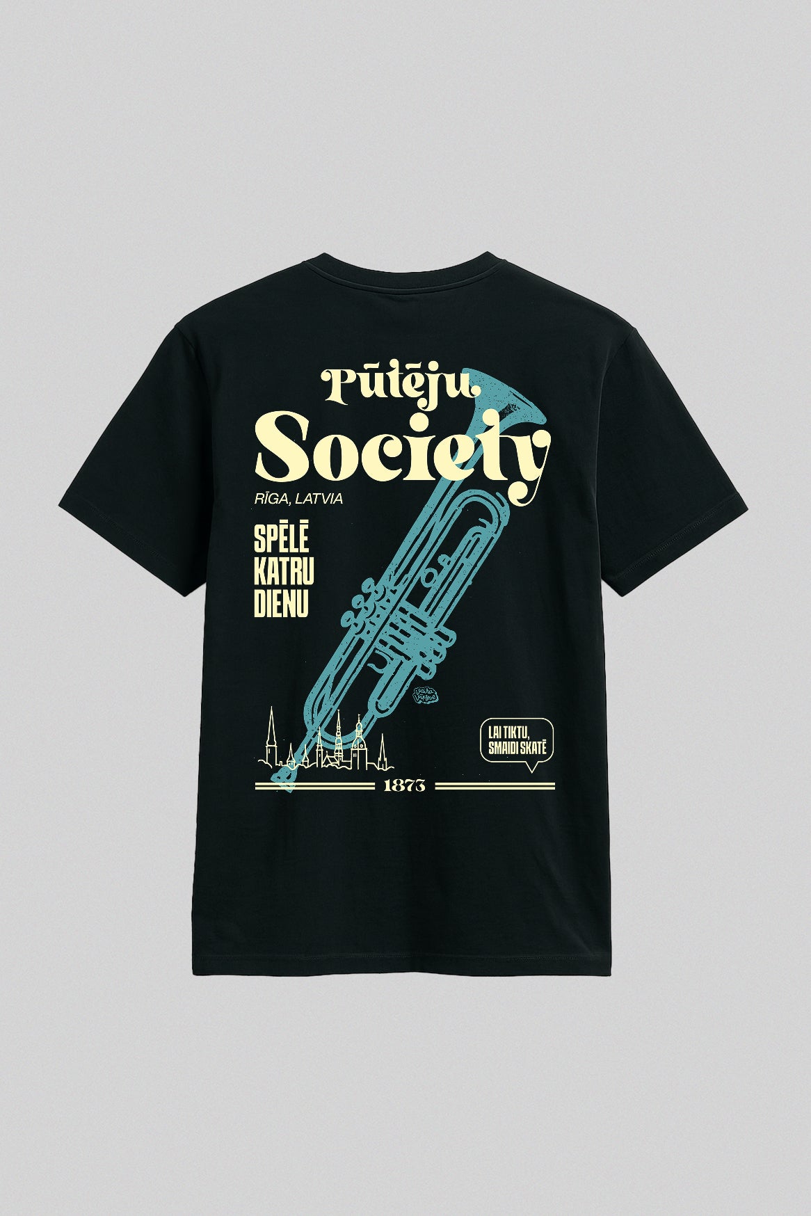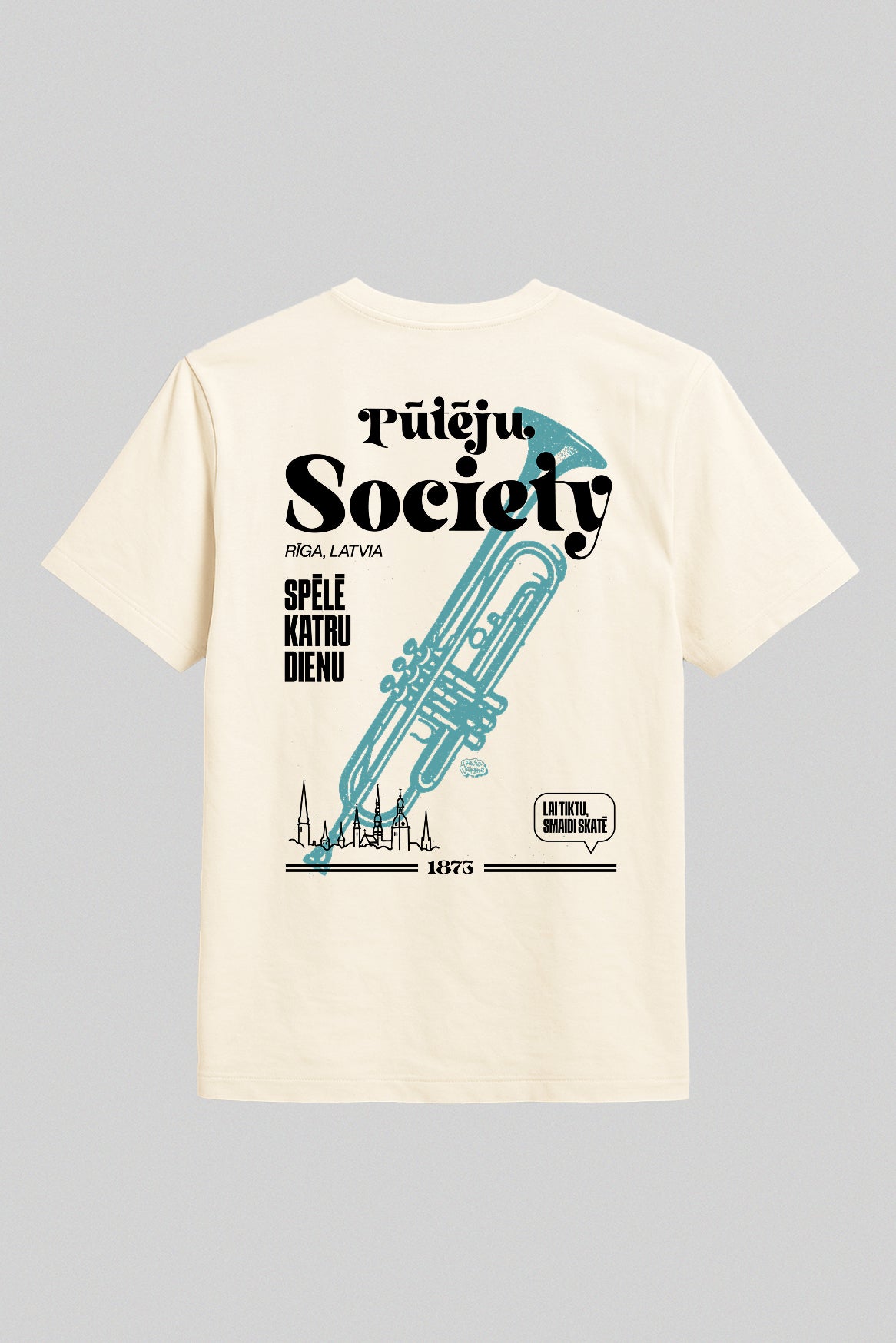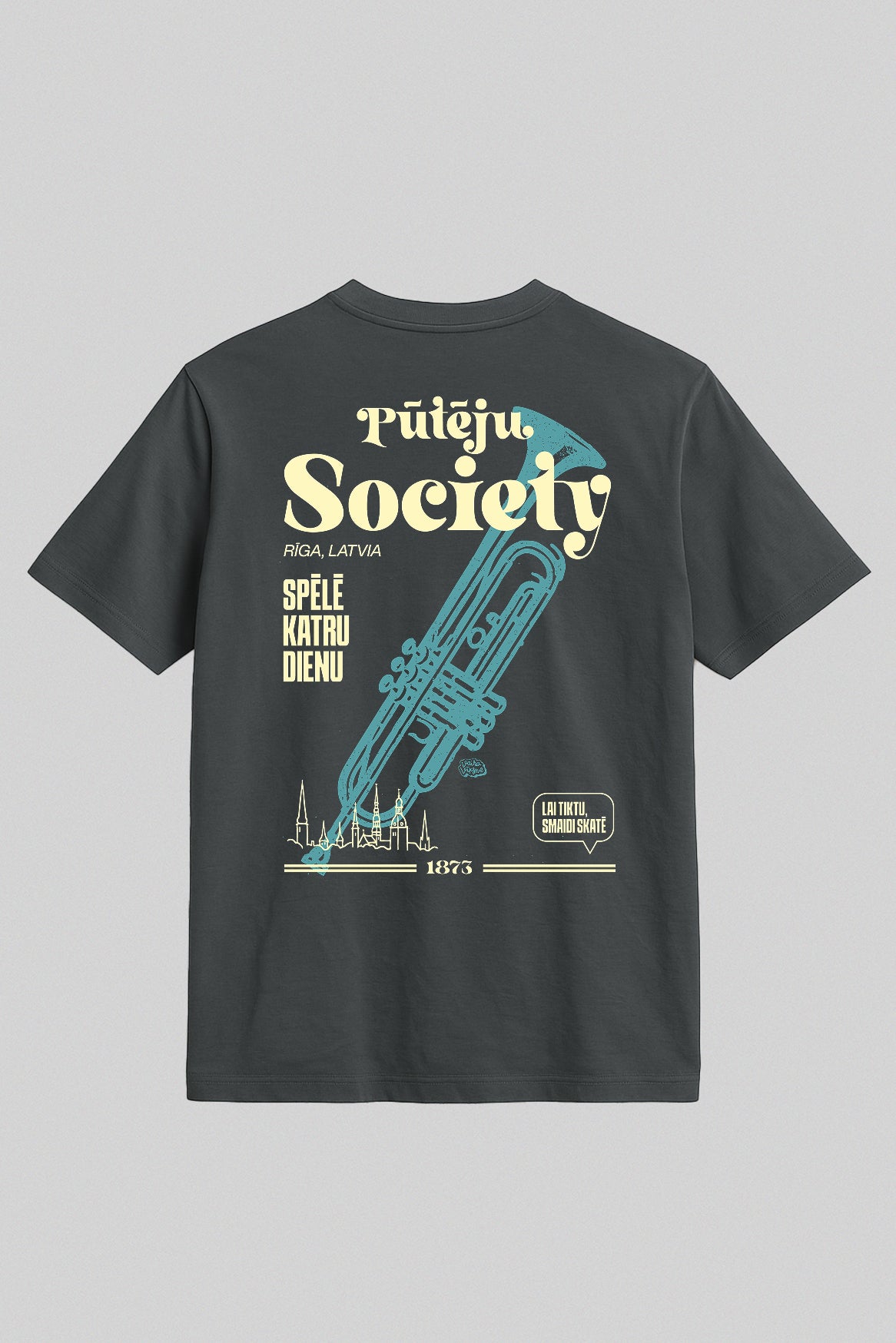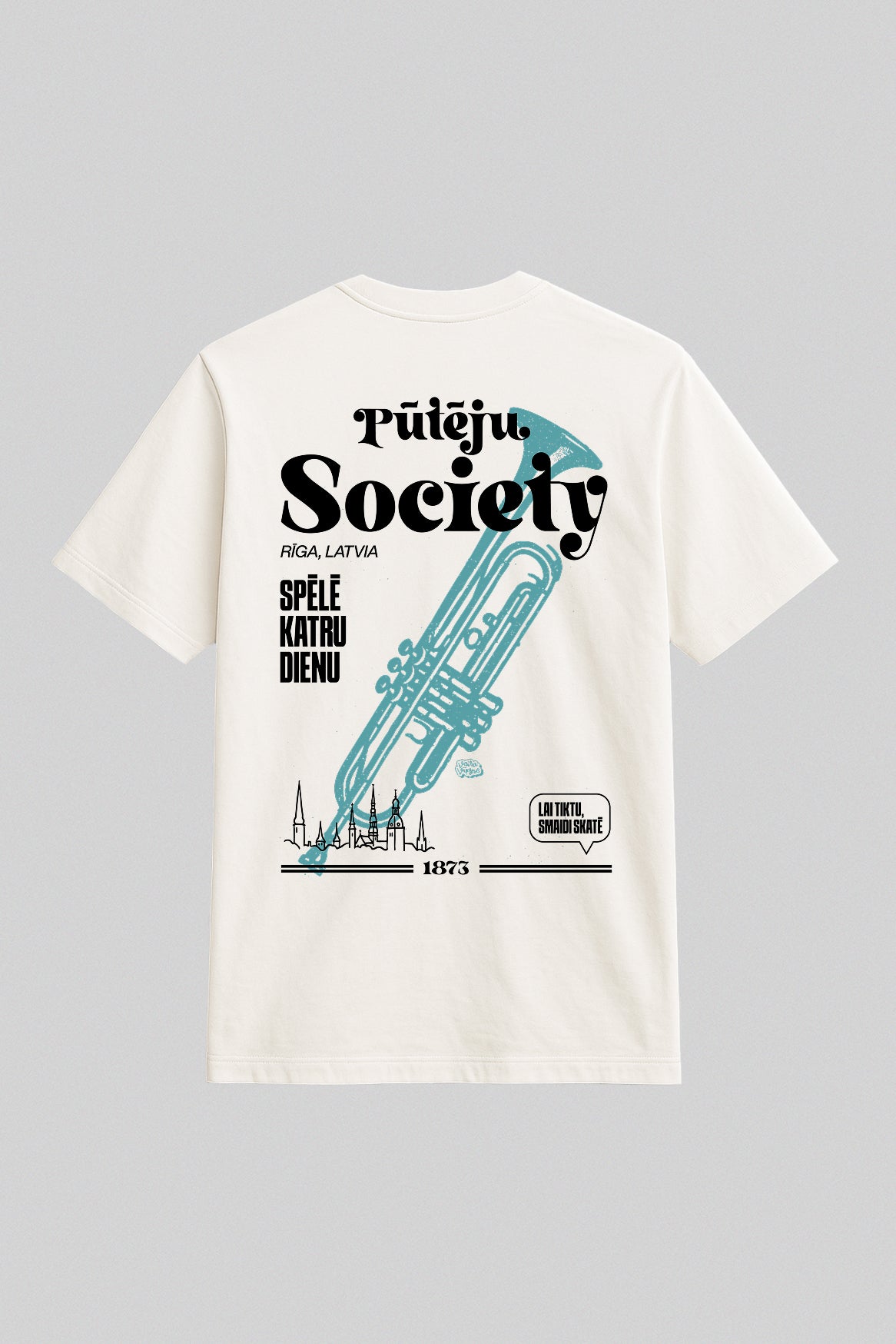 No Jūrmalas prospekta gājiena līdz mazpilsētas zaļumballei: tiklīdz atskan pirmā trompetes nots, Latvija sastingst goda stājā un pēc tam soļo līdzi. Šis krekls ir izveidots tieši tiem, kas pazīst misiņa elpu — uz muguras iespaidīgs, retro-zilganzaļš trompets siluets, pāri tam lepns uzraksts Pūteju Society un devīze “Spēlē katru dienu”. Uzvelc un pasaki pasaulei, ka tavs pulkstenis sit četrdaļu takti.