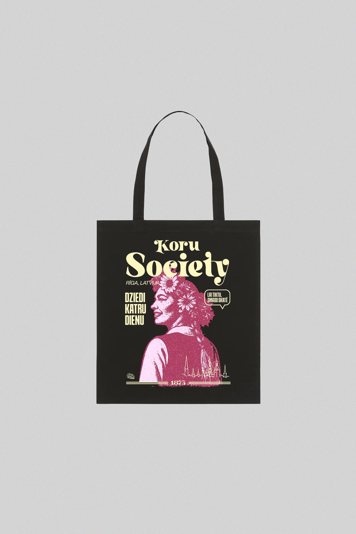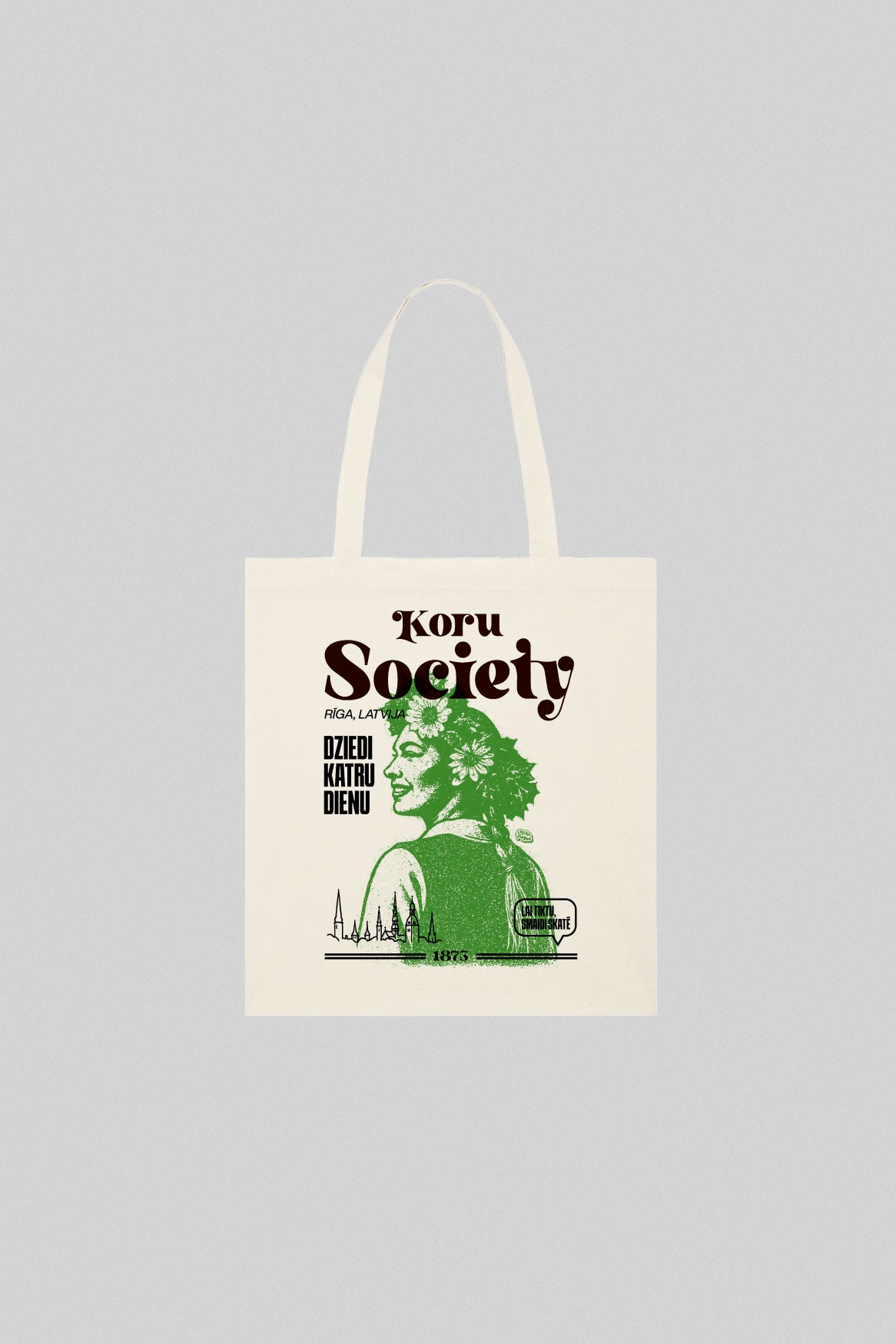 Skaitļi stāsta paši par sevi: teju katrs desmitais latvietis dzied korī un ik pēc pieciem gadiem vairāk nekā 40 000 balsu savienojas milzu kopkorī Mežaparkā. Dziesma nav pasākums, tā ir nacionālais reflekss — no bērnudārza rotaļas līdz senioru rītam parkā. Tieši šo nerimstošo daudzbalsību iemieso “Koru Society” maisiņš.