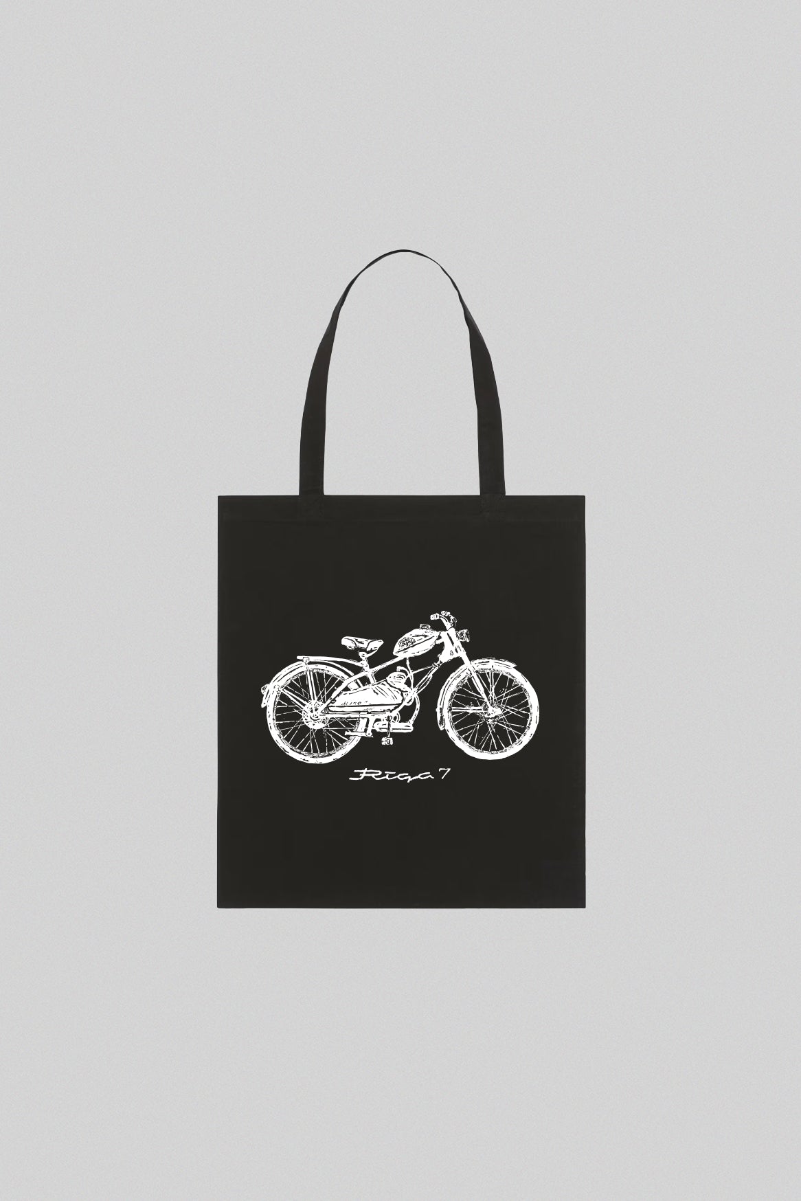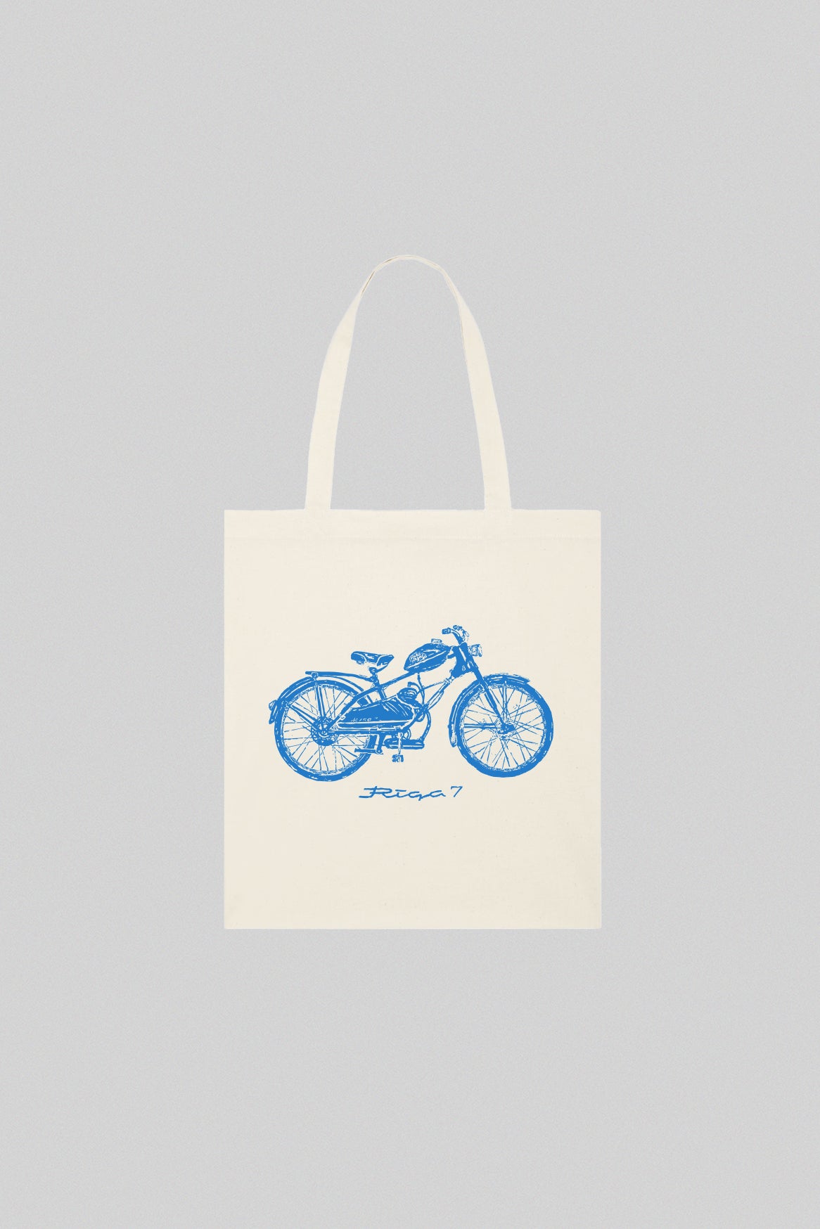 Kad pūš viegls pretvējš un smaržo benzīns ar asfaltu, galvā uzreiz iečukstas nosaukums Rīga-7 — mopēds, kas reiz dārdēja pa pagalmiem un pieveda vasaru tuvāk. Tagad tā kontūras “nobrauc” tieši pa auduma vidu koši zilā krāsā uz gaišā adumua un baltā uz melna, lai ikdienas somā ieaugtu mazs brīvības motoriņš.