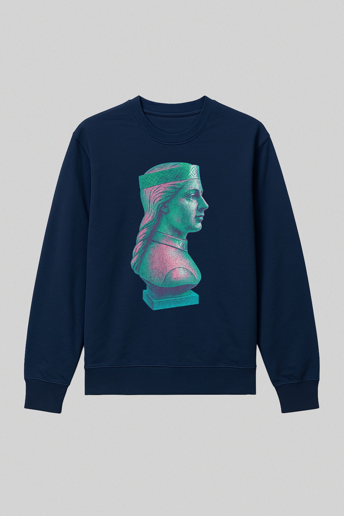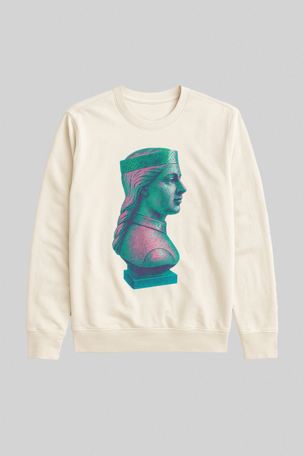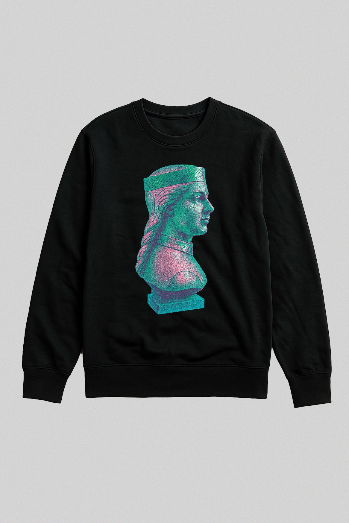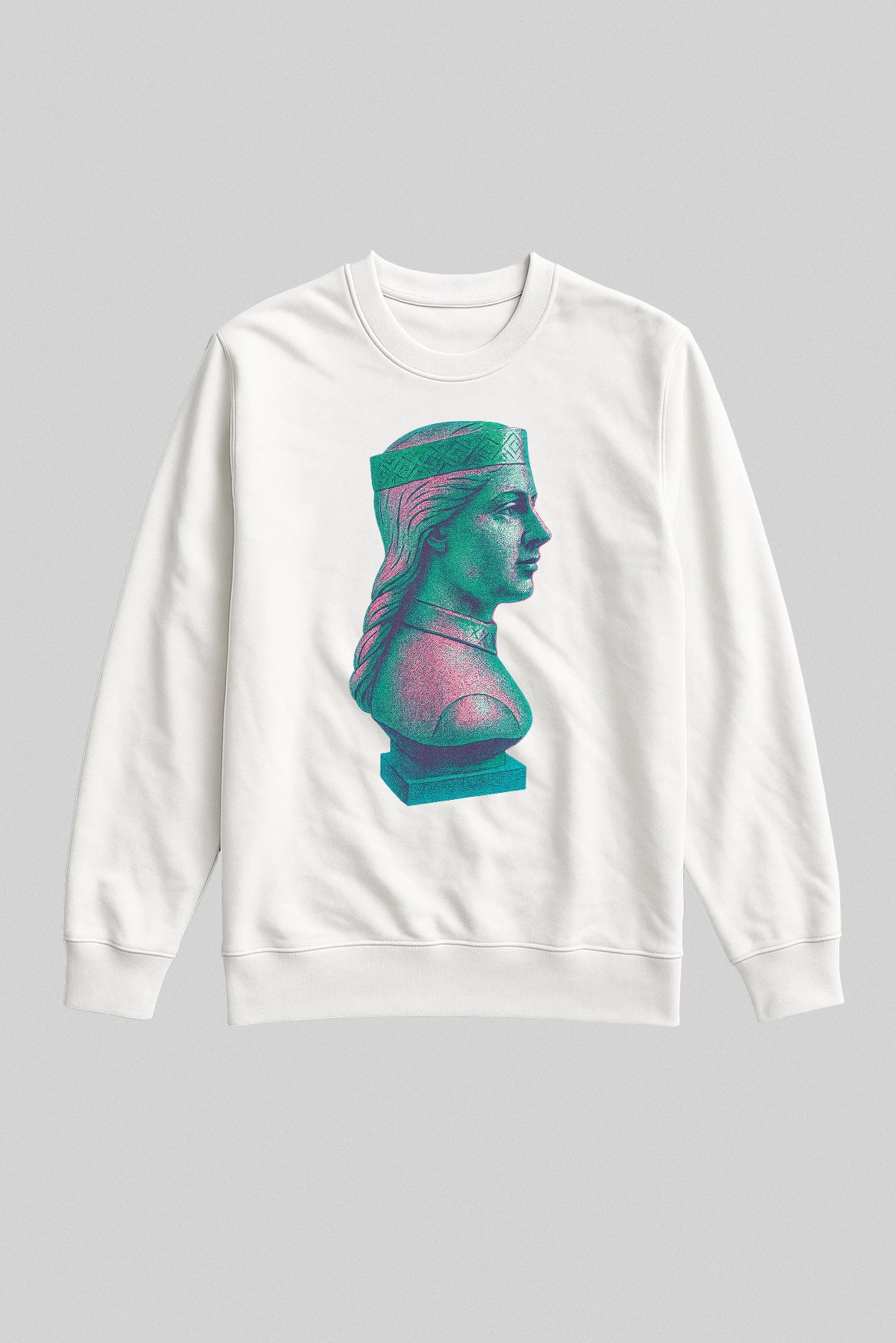 Bize pakļāvusies ziemeļvējam, vainags rotaļājas starp magentas ziediem un smaragda lapām, bet skatiens joprojām droši lūkojas tālumā — it kā katra rīta saules stars būtu jauna tautasdziesmas rinda. Šis T-krekls aicina pievērsties folkloras supervaronēm: tautumeitām, kuras spēj vienā solī apvienot lauku pļavas un pilsētas neona gaismu.