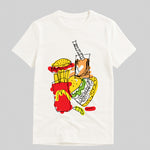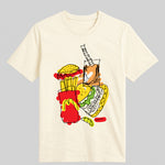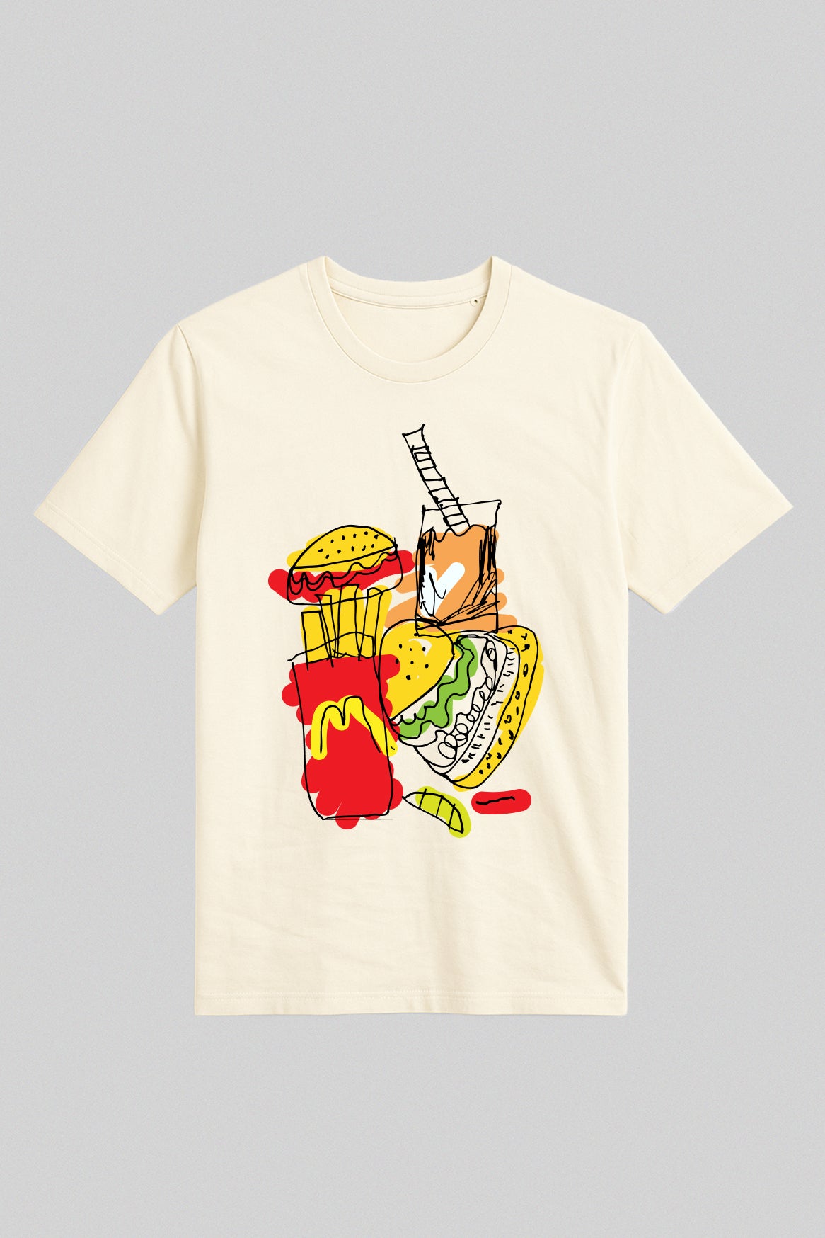 Šis krekls izgatavots no 100% sertificētas organiskas kokvilnas, nodrošinot maigumu ādai un cieņu pret dabu. Uz smilškrāsas fona izceļas spilgts un brīvs grafikas zīmējums ar klasisko ēdienu trijnieku – burgeru, frī kartupeļiem un dzērienu, kas uzlādē garastāvokli un izsauc smaidu. Oriģināls zīmējums.